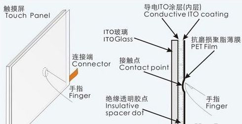 电阻式触摸屏利用压力感应进行控制。电阻触摸屏的主要部分是一块与显示器表面非常配合的电阻薄膜屏,这是一种多层的复合薄膜,它以一层玻璃或硬塑料平板作为基层,表面涂有一层透明氧化金属(透明的导电电阻)导电层,上面再盖有一层外表面硬化处理、光滑防擦的塑料层、它的内表面也涂有一层涂层、在他们之间有许多细小的(小于1/1000英寸)的透明隔离点把两层导电层隔开绝缘。 当手指触摸屏幕时,两层导电层在触摸点位置就有了接触,电阻发生变化,在X和Y两个方向上产生信号,然后送触摸屏控制器。控制器侦测到这一接触并计算出(X,Y)的位置,再根据模拟鼠标的方式运作。这就是电阻技术触摸屏的基本原理。