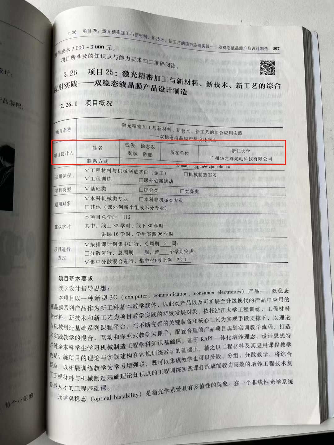 基于新材料、新技术、新工艺共同推出的新型教材。项目以新型3C产品一双稳态液晶膜系列产品作为新工科基本教学教体,项目依托浙江大学工程训练、工程材料与机械制造基础系列课程平台,在不断完善的关键装备和核心工艺为实现手段支撑下,以理论和实践教学的混合、互动和探究式教学为抓手,配置合理的产品项目规划实训教学流程,打造并健全本科学生学习机械制造工程学科知识基础课。基于KAPI一体化培养理念,设计思想特色是训练项目的理论与实践建构在常规训练教学的基础上,辅之以工程材料及其应用课程教学要点,以拓展训练教学为学习增强段,既可以集成教学也可以分段、分组、分散教学,将综合了工程材料与机械制造基础理论知识点的工程训练实践课打造成能较为高效的培养工程技术复合型人才的工程基础课。