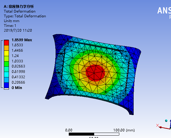 既然底座在一般状况下是可以使用的,那么我们将装配体导入ansys,对装配体进行模态分析,最后用在手写板加载1—5Hz的谐载荷来模拟写字、画图状态下,手写板会不会出现松动.
