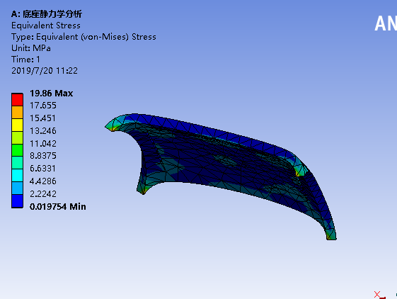 可以通过最后的结果图发现,底座的最大位移出现在底座的中心处,位移量为1.86mm,数值上是比较小的;最大应力值出现在底座的四个支撑点上,最大应力值为19.86MPa,而工程abs塑料的许用应力值为24.5MPa.可以看出即使在3000Pa的压力作用在整个面下,底座仍然能承受.那么在通常在手写板上写字的时候,底座仍然能承受住压力,不会产生较大变形.但是有一点需要注意:由于底座是靠4个支点支撑,所以底座上不能放置太重的物体,以免支点上的应力大于abs的许用应力,致使底座变形.