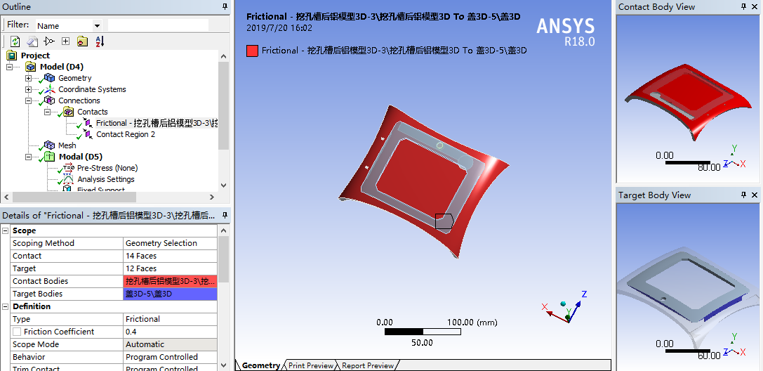 将装配体导入后,我们首先将盖板和底座的接触设为摩擦接触,摩擦系数设为0.3.其它地方的接触由于不是关键部位,所以就直接设为主体接触,不设置摩擦.