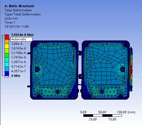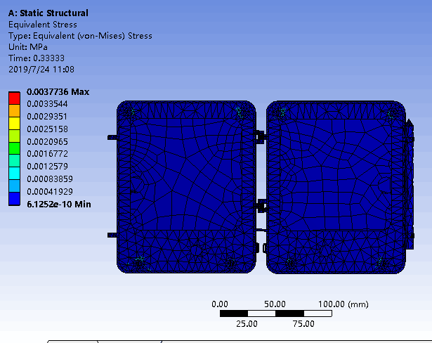 对于折叠式手写板所材料属性也都大同小异,所加载荷为底板固定,上面给一个压力载荷.从结果可见手写板完全承受在正常使用情况下所受的力.