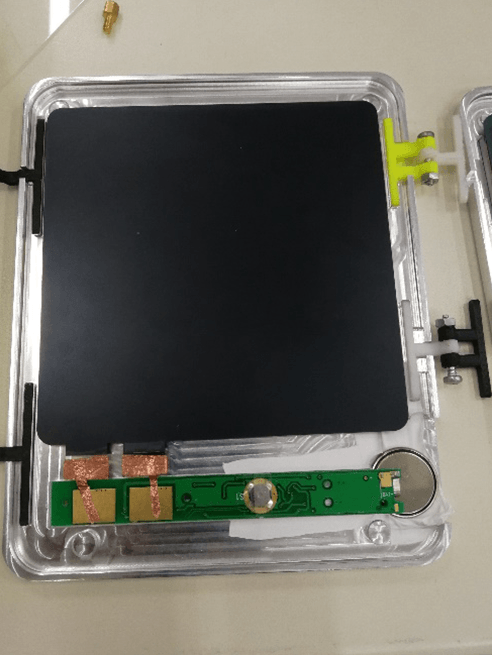 第二大困难是电路板的连接问题.由于我们需要把电路板和电池舒适地放置在槽中,我们把电路板进行了稍微的改造,用导电带实现正负极连接,使电池得以平放.然而由于电路板与液晶膜极其敏感脆弱,研究如何连接才能使其正常工作花了我们较长时间,甚至烧坏了不止一块电路板.