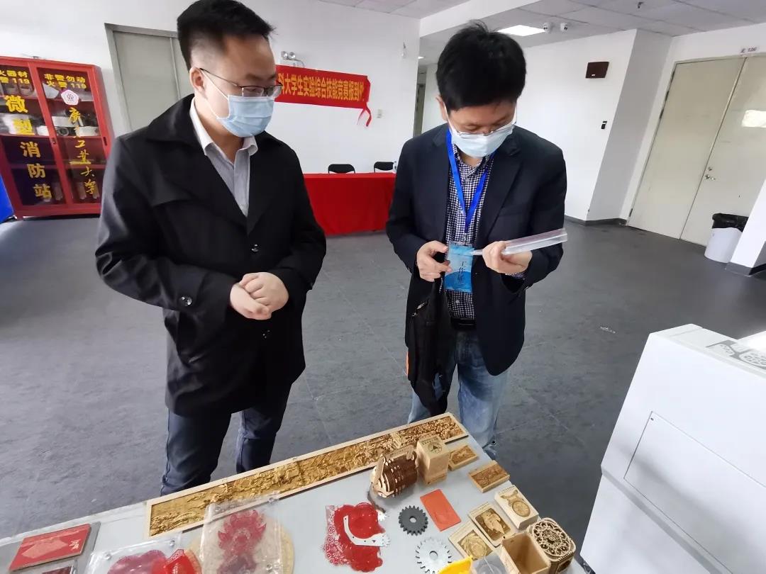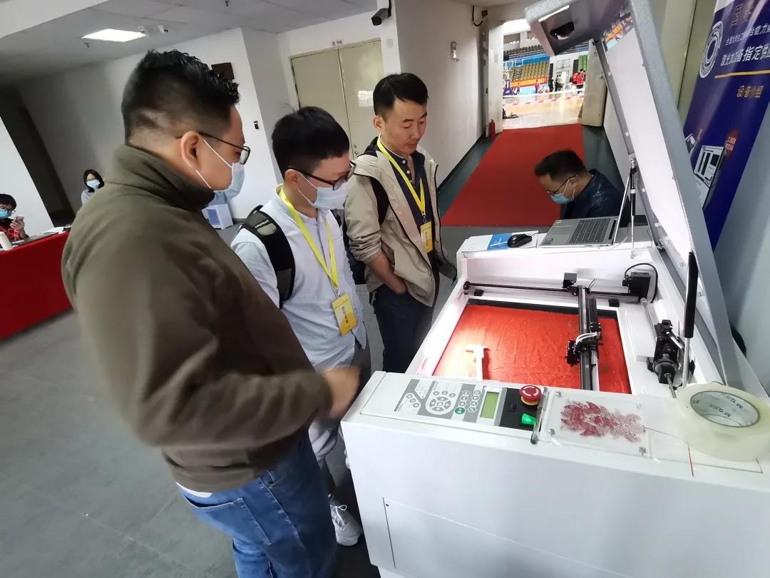向参观者演示机器切割剪纸。华之尊激光设备光斑极细,激光与卡纸的接触面积极小,从而在切割过程中不会产生发黑、发黄、起火及碳化等效果,切割R弧可达0.2mm,切缝小于0.03mm,能将平面图案通过华之尊激光精确切割出来。
