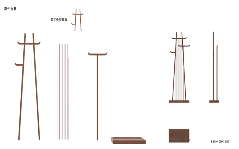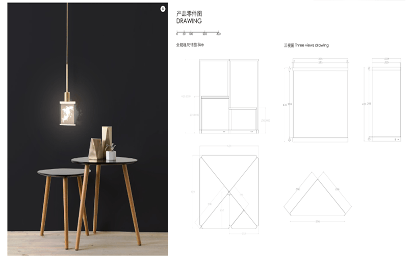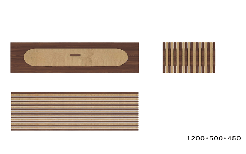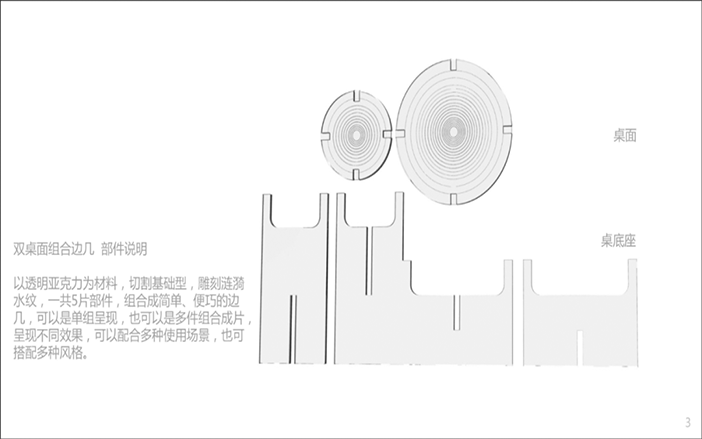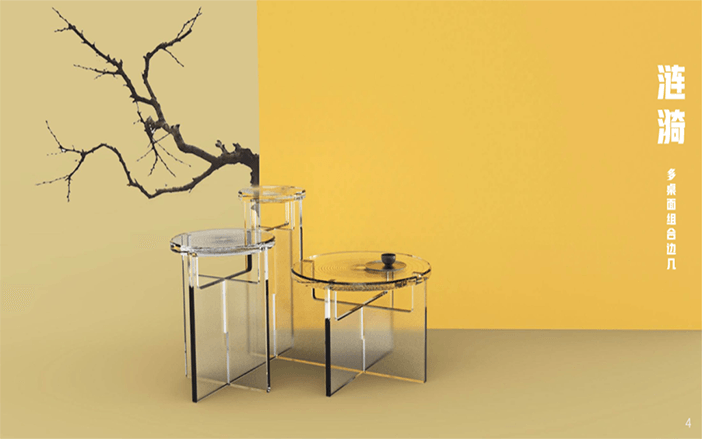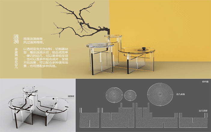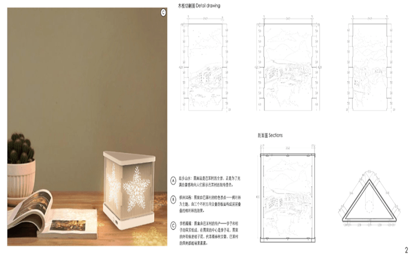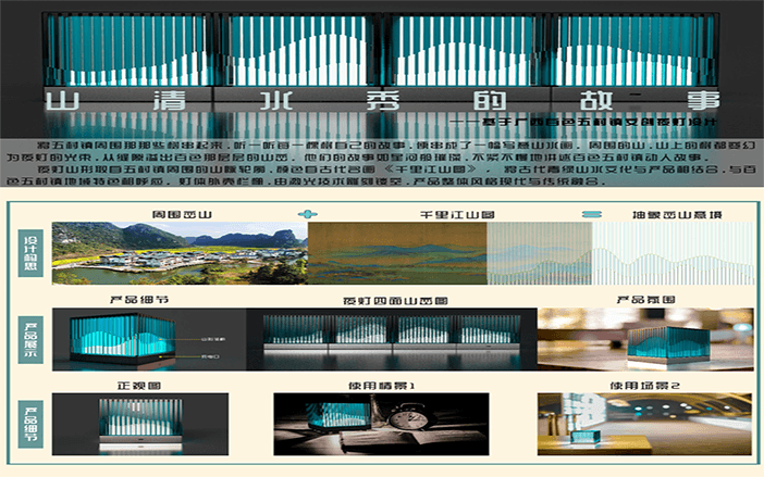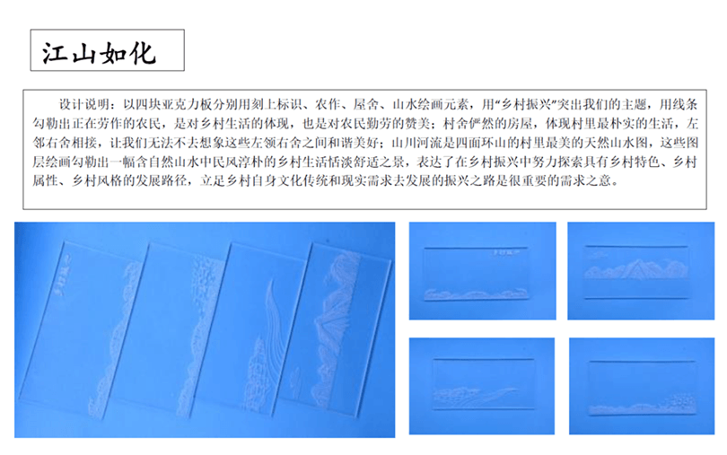 设计说明:四块亚克力板上刻有标牌、农家、房屋和山水画等元素。线条勾勒出农民和别墅,反映出简单的乡村生活。邻里相见,表现出和谐美好的人际关系。山脉、河流代表了宁静舒适的乡村生活。根据自身的文化传统和农村的实际需要,探索乡村振兴之路。