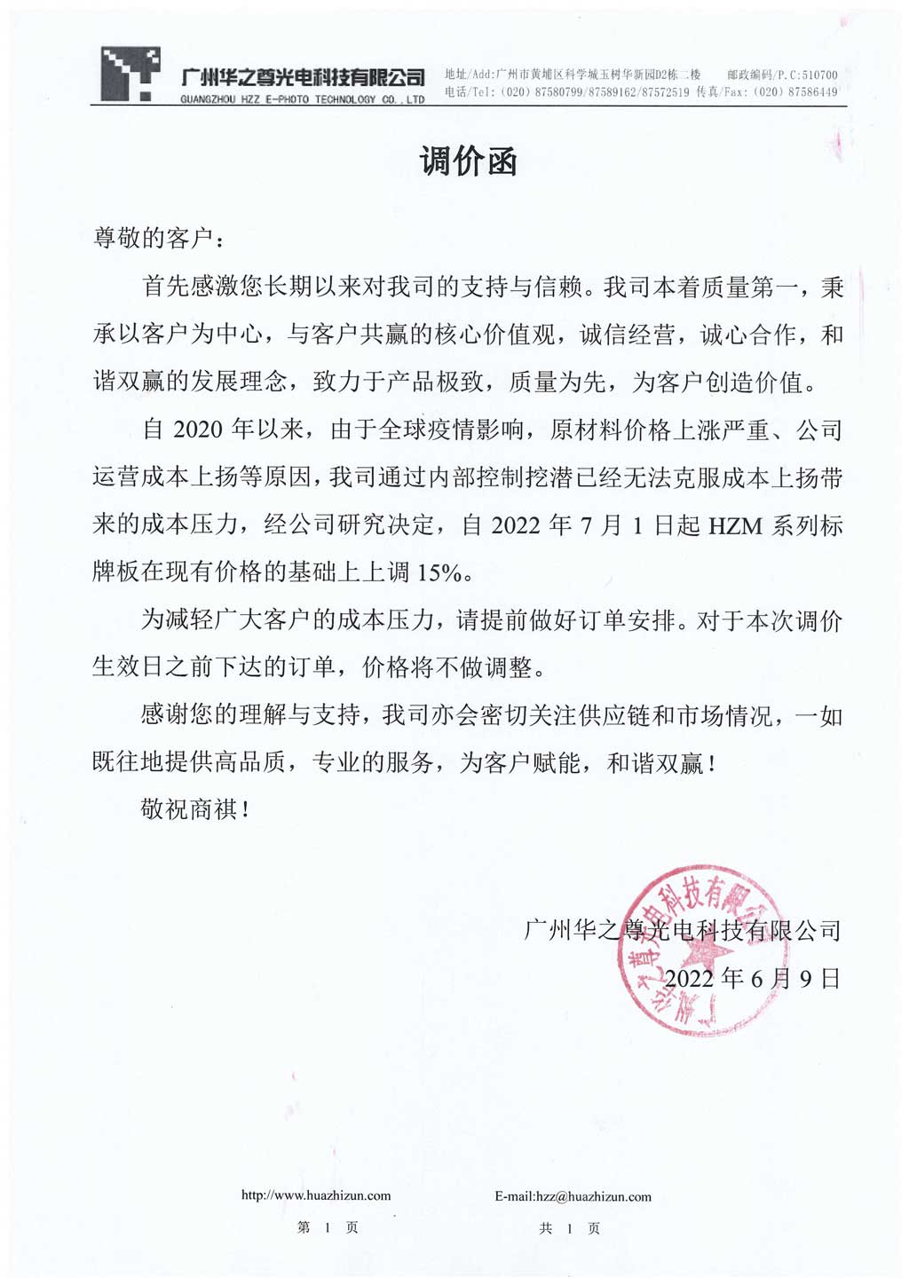 自2020年以来,由于全球疫情影响,原材料价格上涨严重、公司运营成本上扬等原因,我司通过内部控制挖潜已经无法克服成本上扬带来的成本压力,经公司研究决定,自2022年7月1日起HZM系列标牌板在现有价格的基础上上调15%。