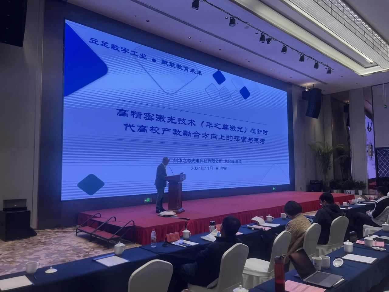总经理秦斌在会议现场以《高精密激光技术(华之尊激光)在新时代高校产教融合方向上的探索与思考》为题,作了会议报告。报告深入浅出地介绍了华之尊激光在先进制造业中的典型案例,展示了激光技术在新材料、新技术、新工艺及新应用等方面的突破性进展。还分享了公司通过“激光技术+N”的表现形式,将企业先进的激光技术和设备引入高校实验室的成功经验,助力学校在教学、科研和产教融合方面取得卓越成效,为培养创新型新时代人才提供了系统化的解决方案。